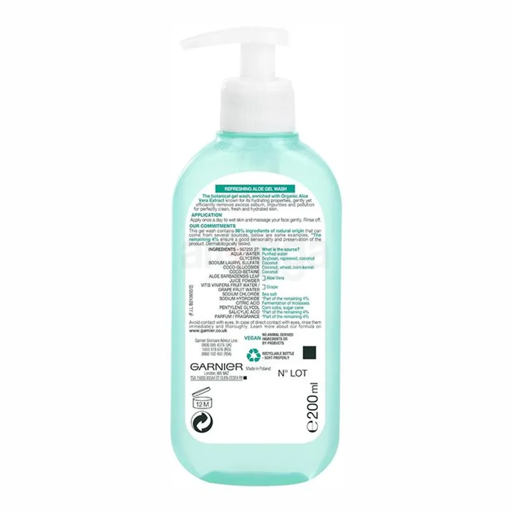 Garnier's first gel wash made with 96% ingredients of natural origin, enriched with Aloe Vera Extract, known for its hydrating powers. It efficiently removes excess sebum, impurities and pollution for perfectly clean, fresh and hydrated skin.