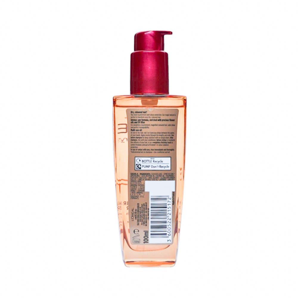 Elvive Extraordinary Oil is enriched with a precious blend of 6 flower extracts. The non-greasy feel formula leaves hair looking soft, shiny and weightless. Ultra versatile: Use before shampooing, before styling or as a finishing touch for a perfect hair day. For coloured hair, leaving the colour luminous and the hair smooth.