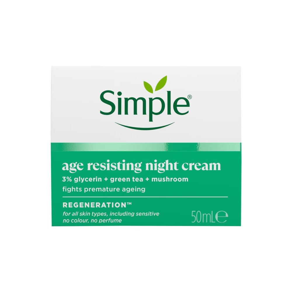 Simple Regeneration Age Resisting Night Cream is a powerful moisturiser for overnight skin rejuvenation. It's enriched with 3% Glycerin, Green Tea, and Mushroom Extract that work harmoniously to replenish your skin while you sleep. This night cream is an effective blend that helps reverse the early signs of ageing, leaving your skin feeling smooth, nourished and youthful-looking. Simple has been creating skin-friendly products since 1960, always excluding harsh chemicals from our formulations. Our Age Resisting Night Cream is no different. Crafted with a blend of skin-loving ingredients, it provides everything your skin needs for overnight rejuvenation, and nothing it doesn’t – staying true to our promise of delivering simple and effective skin care. The Simple Age Resisting range is designed to provide nourishing care for ageing skin. After cleansing with Simple Age Resisting Facial Wash and applying our Simple 10% Vitamin C + E + F Booster Serum, smooth the night cream over your face to help reverse the signs of ageing and wake up to rejuvenated, youthful-looking skin.