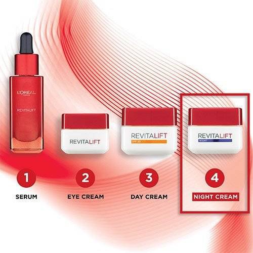 The Revitalift Hydrating Night Cream Advanced pro-retinol is a powerful dermatologist-inspired anti-wrinkle ingredient, which helps to smooth the skin's surface. Fibrelastyl is a forming complex, which helps to reinforce skin elasticity for extra-form skin. Age: 40+.
